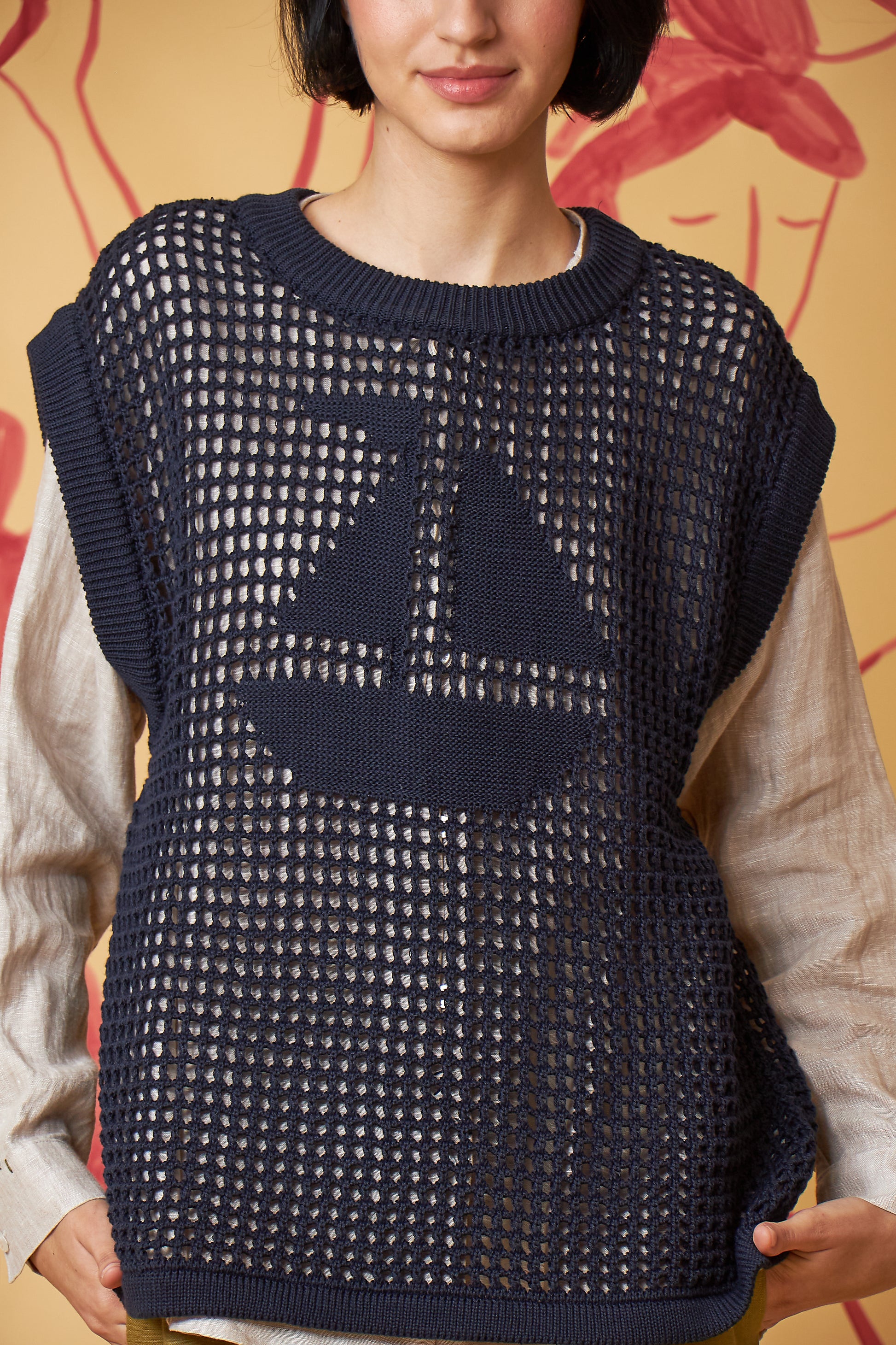 Knitted blouse, straight cut, rounded neckline and boat-shaped knit on the front.