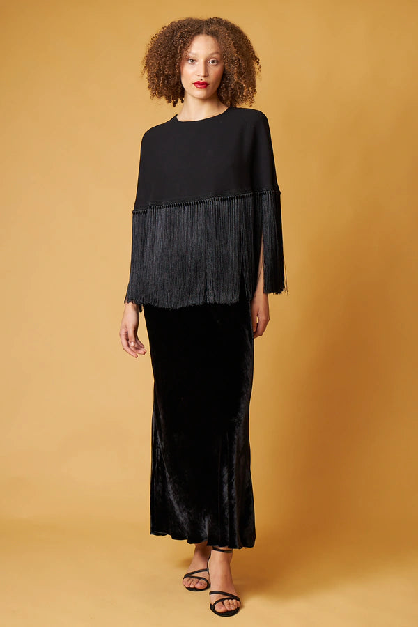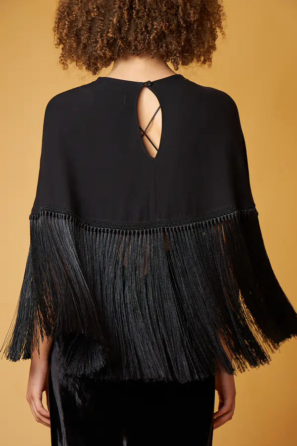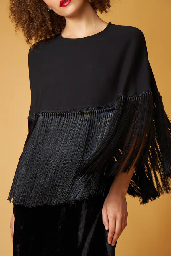 Cover made of viscose, straight modeling with hand crochet and application of fringes on the hem, back button closure.