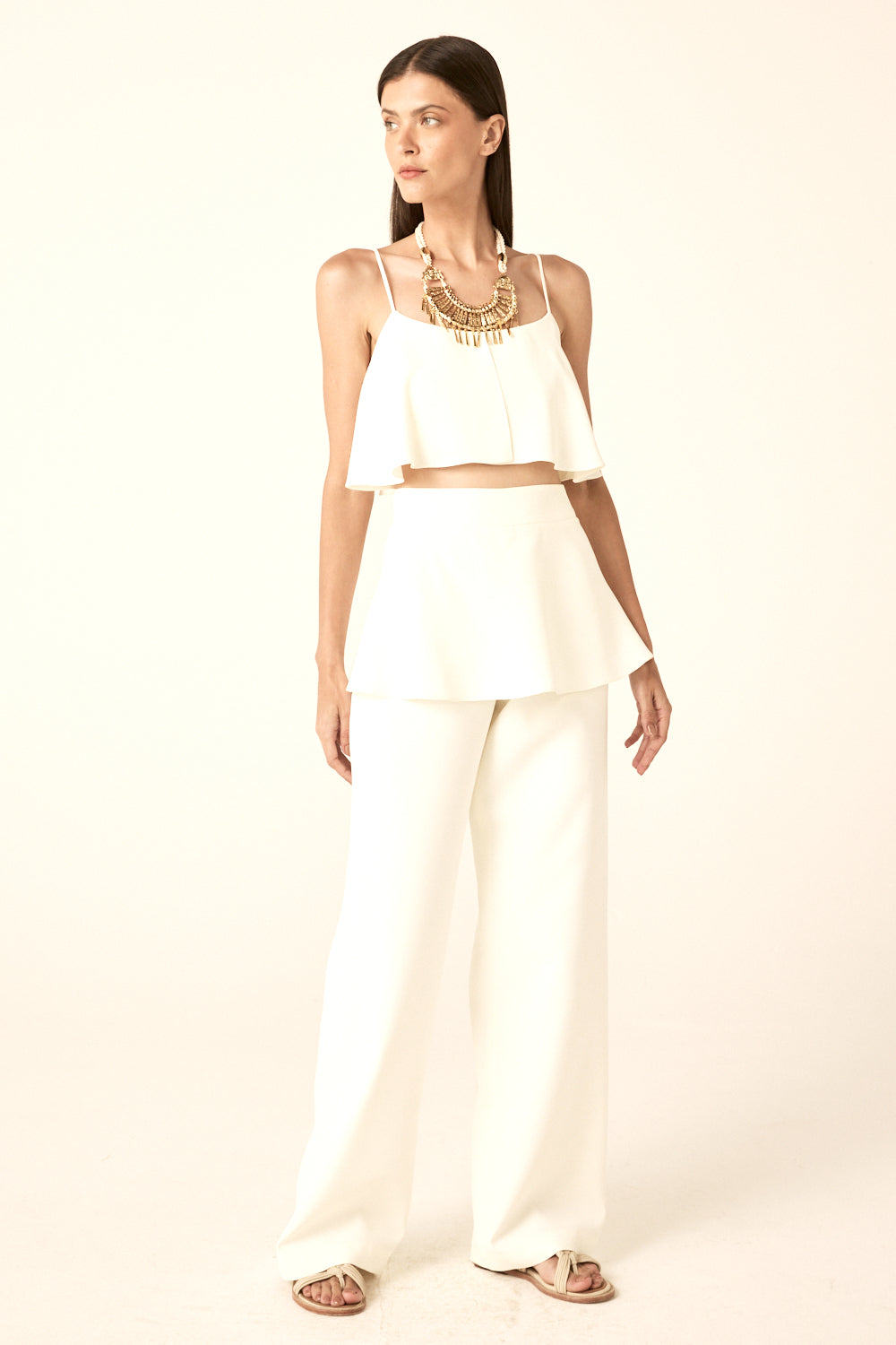 Celebration Top features thin spaghetti straps and a simple, slightly scooped neckline. The body of the top is fitted through the bust and then flares out into a circular peplum or flounce that sits just above the natural waist. It has a back zip closure.