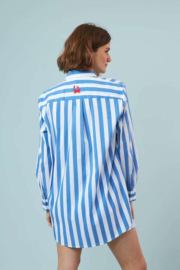 Shirt made of cotton, striped pattern, elongated length, long sleeves, front pocket with MAR embroidery and crab embroidery on the back yoke.
