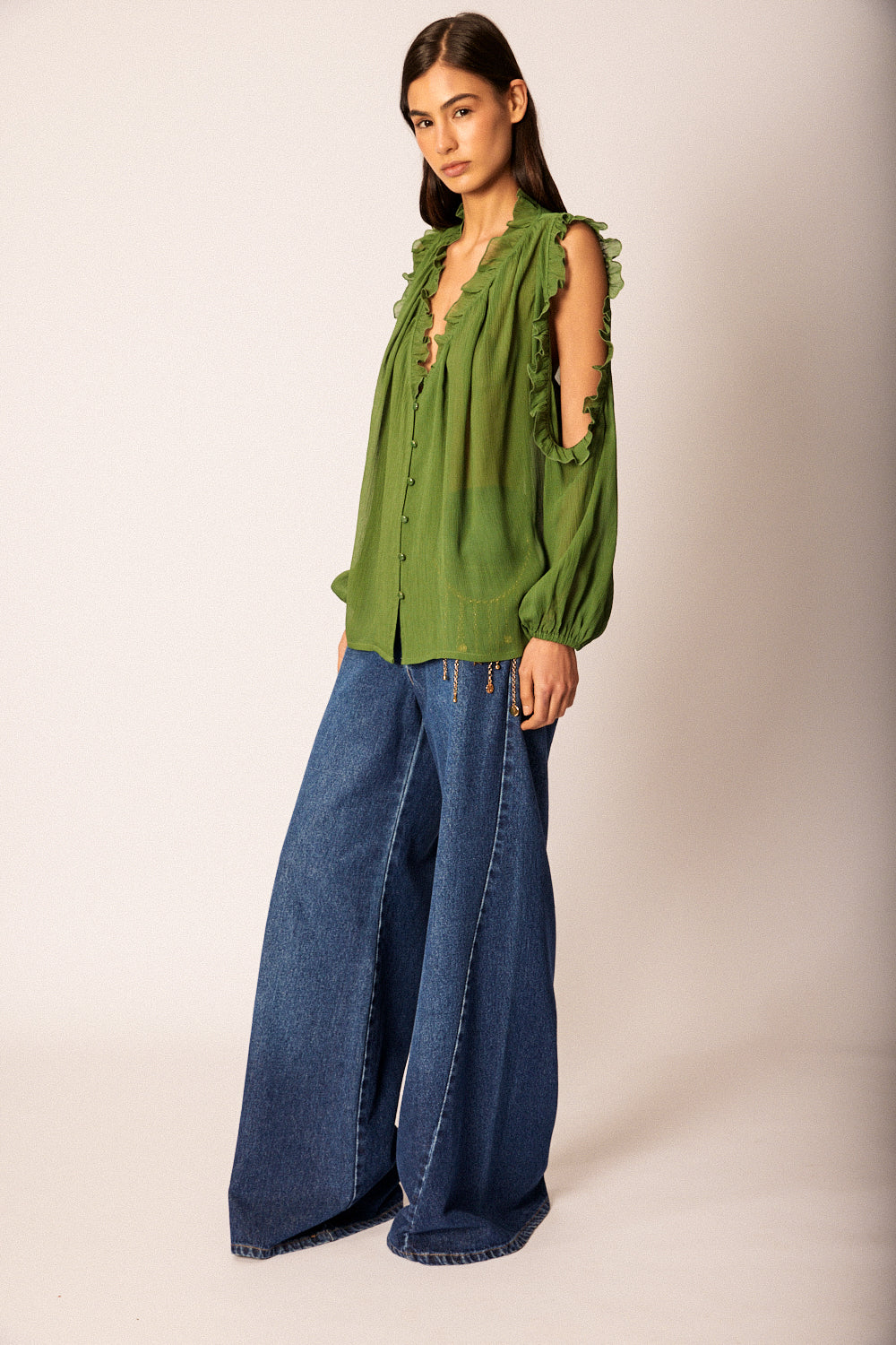 Esmeralda Blouse is characterized by its cold-shoulder design, where the shoulders are exposed while the sleeves maintain a full length that gathers at the wrist. The neckline is a V-neck that extends into a full button-front placket finished with small, color-matched buttons. Adding a romantic and textured element, the blouse features layers of ruffles detailing the V-neckline and framing the cutouts along the shoulders. The fabric is light and sheer, giving the garment a soft drape.