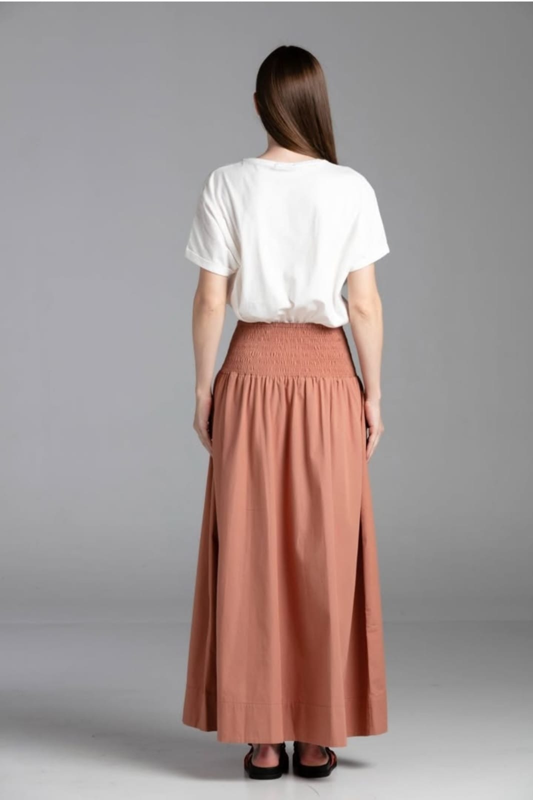The Frankie Maxi Skirt features a wide, voluminous silhouette with an elasticated smocked waistband that offers comfort and flexibility. It includes two oversized front pockets for a functional yet laid-back style. Its structured cotton gives it a clean, modern drape. Perfect for effortless everyday looks.