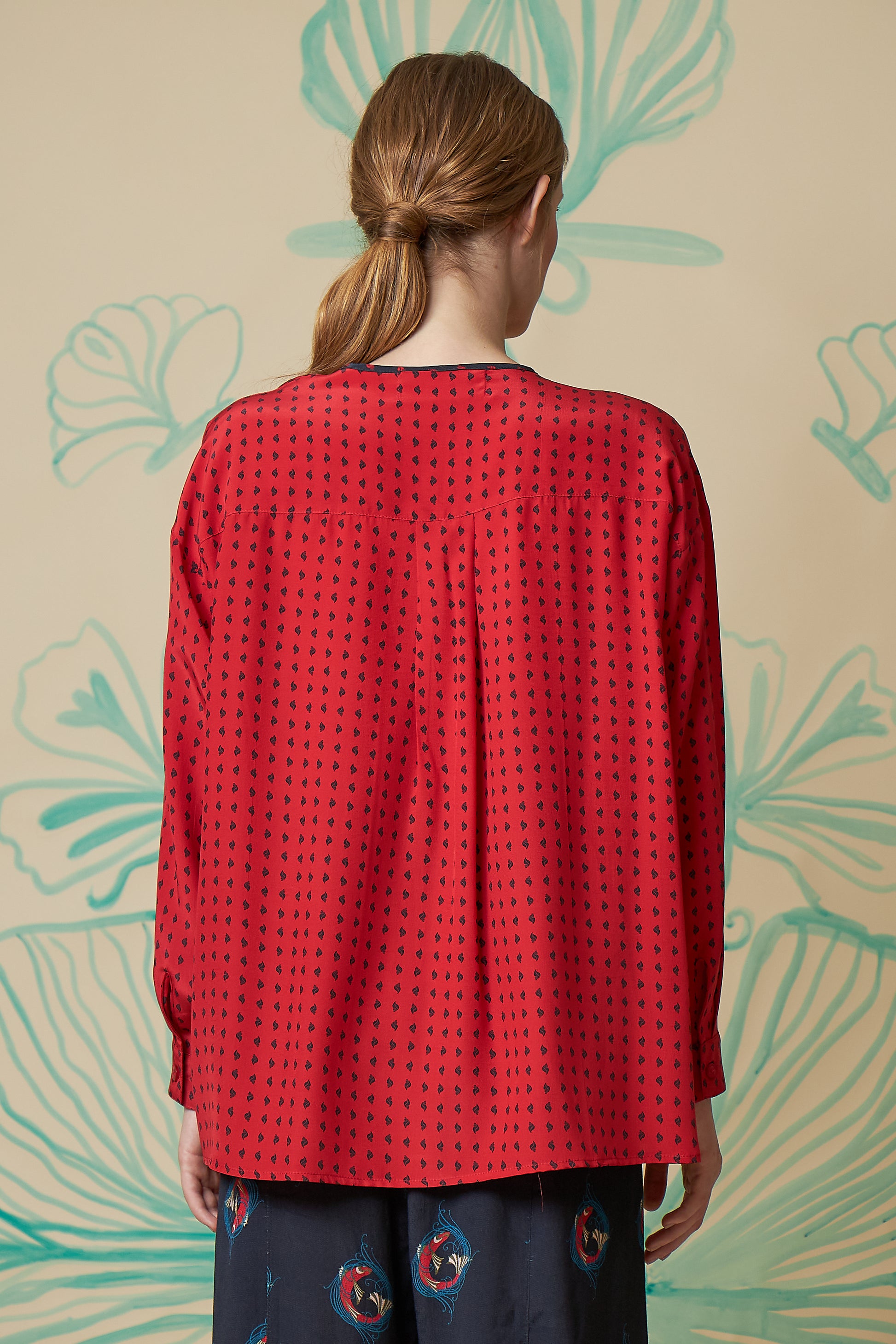 Shirt made of silk with a shell pattern, exclusive to Le Soleil for the Secret Life of Shells collection, rounded neckline with printed strip in contrasting color, long sleeves and front closure with personalized buttons.