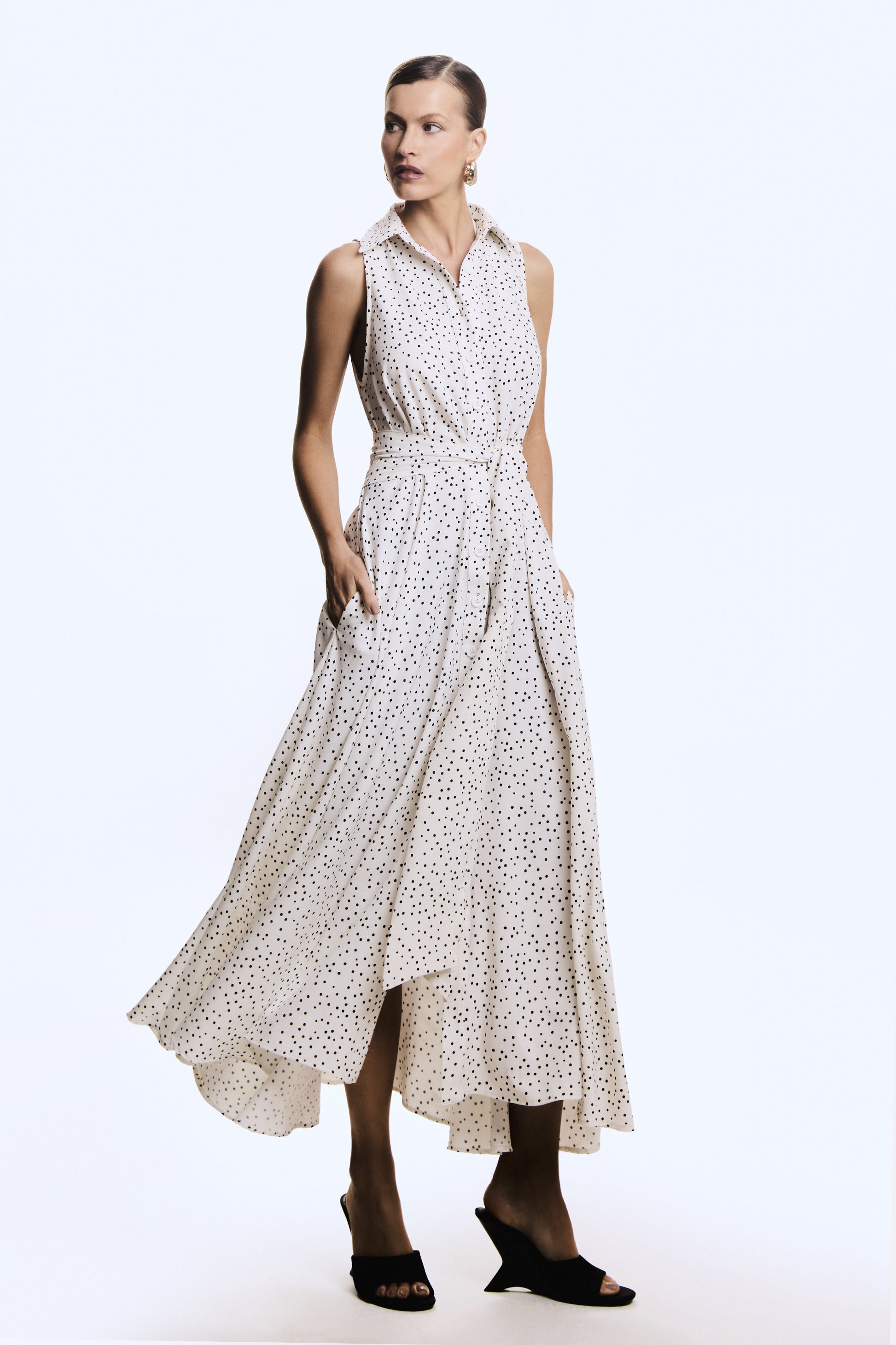 An embodiment of refined restraint and timeless allure. This midi dress is meticulously constructed from luxuriously fluid fabric that moves with graceful intention. The traditional collar and front button detailing speak to heritage craftsmanship, while a polished polka dot print belt cinches the waist with understated precision. The generous drape facilitates effortless elegance and unrestricted movement, positioning this piece as the quintessential choice for discerning occasions where sophistication and comfort converge seamlessly.