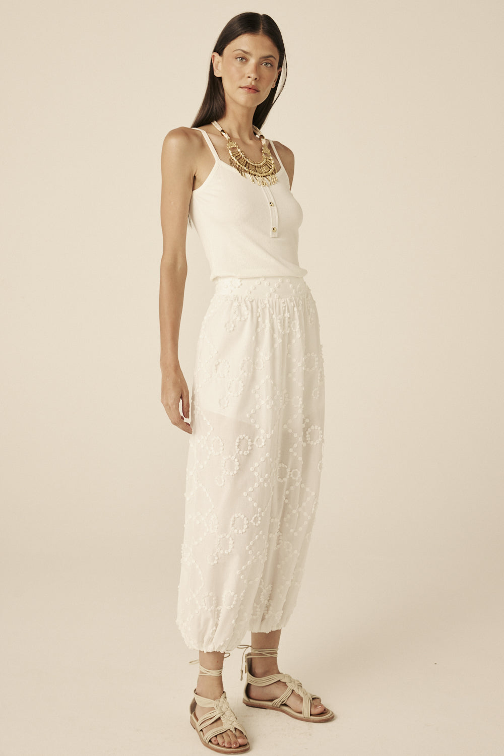 Hailey Top is a fitted white tank top made from a fine vertical rib-knit fabric. It features thin spaghetti straps and a slightly scooped neckline. The key detail is the henley placket at the center front, which is secured by small gold-toned buttons.
