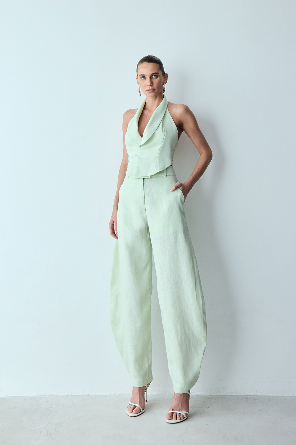 Blouse made of Linen in Mint Green color. The piece has a fitted fit, halter front, crossed lapel, asymmetrical hem and back tie.