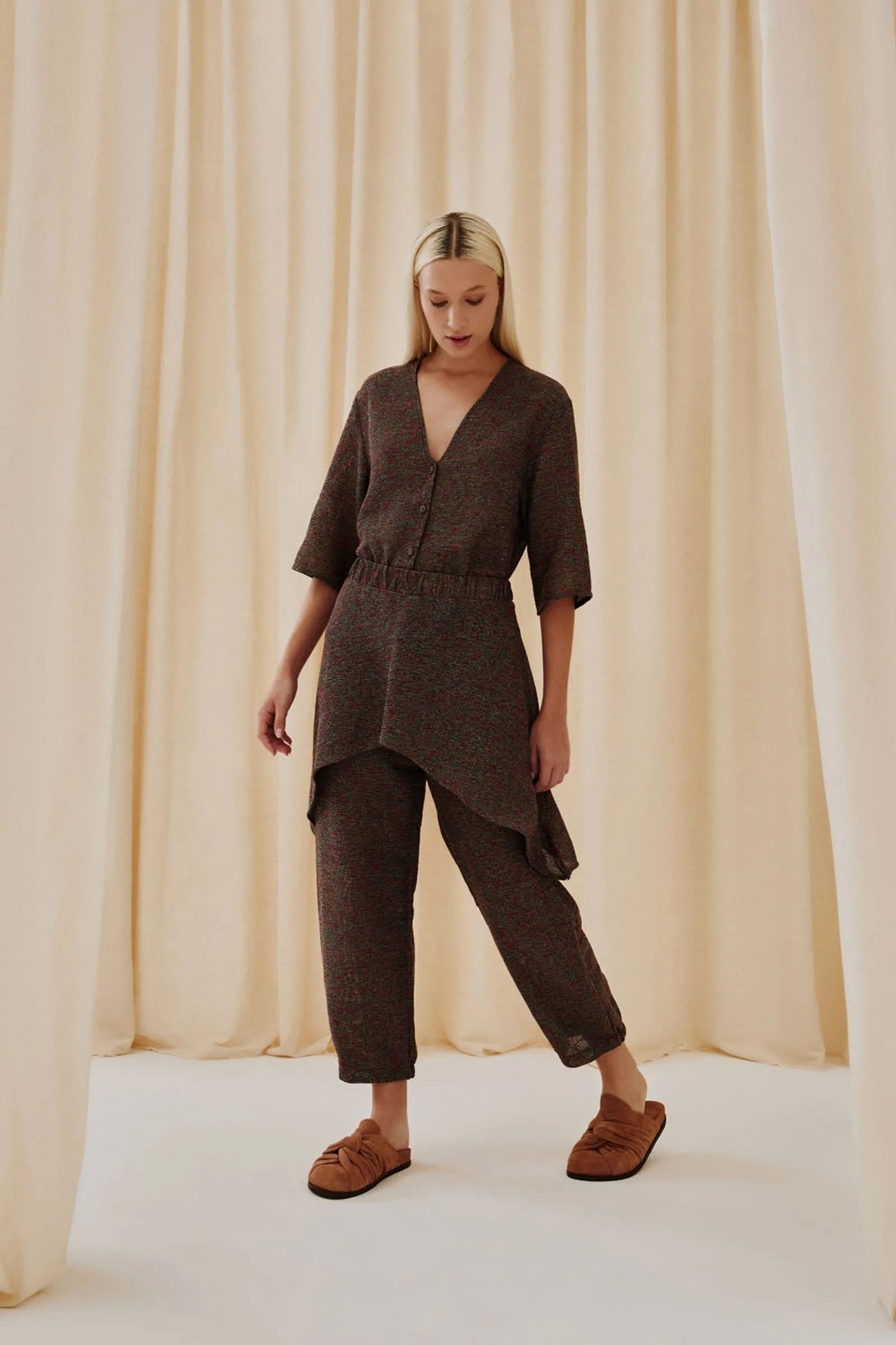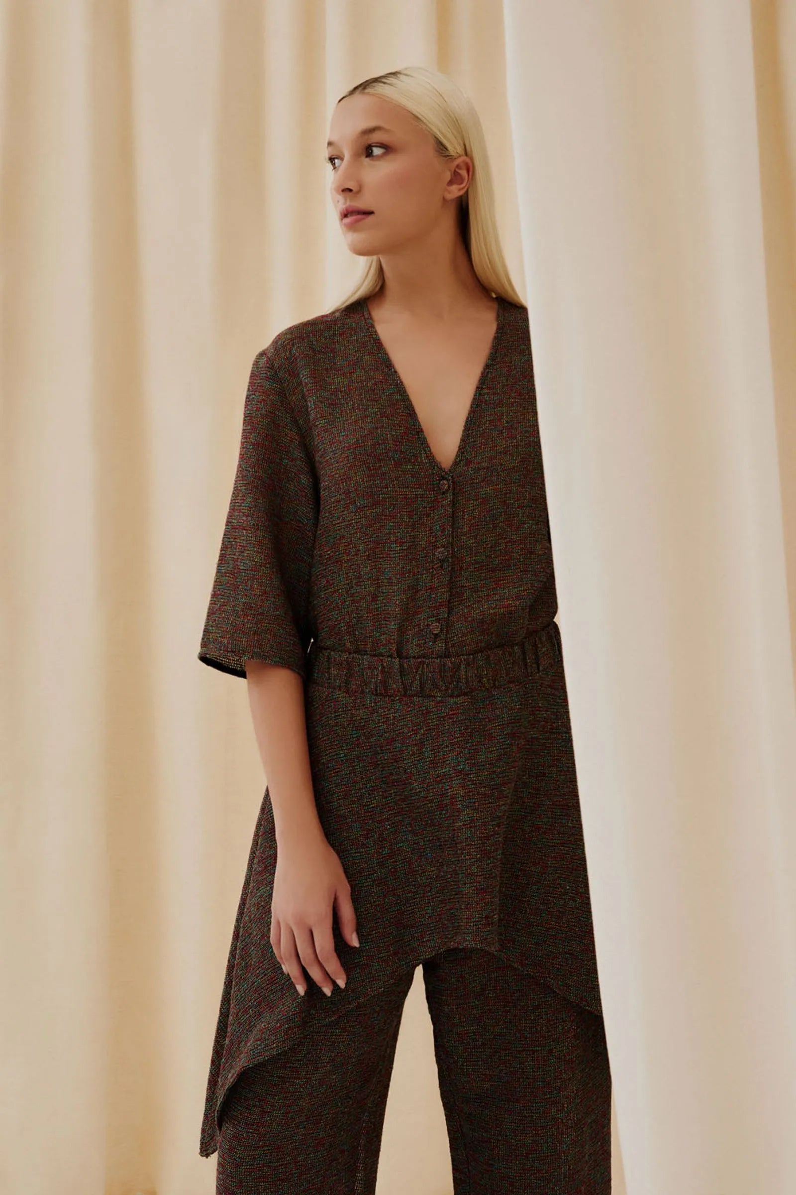 The Lagarta Shirt is made of multicoloured textured cotton fabric. It has elbow-length sleeves, V-neck button-down front.