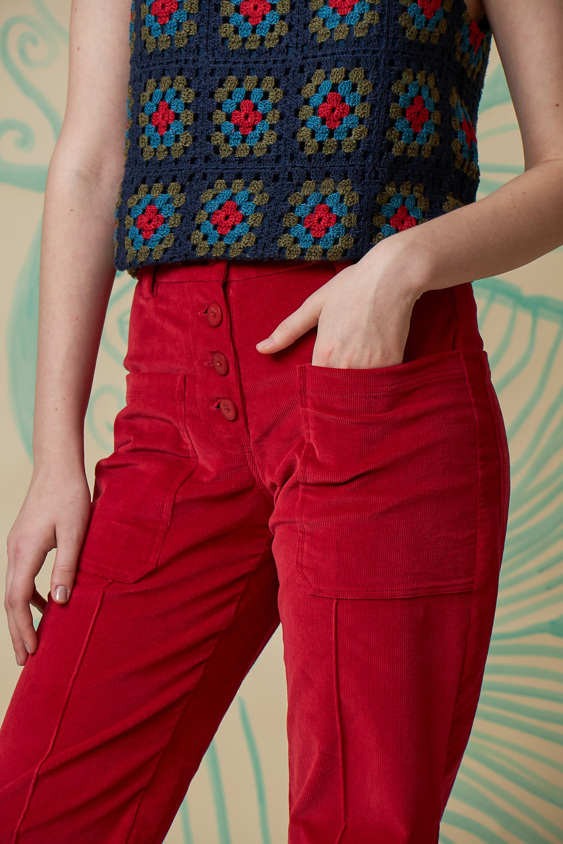 Straight pants made of corduroy, visible pockets on the front and back, ribbed detail, waistband with loops and closure with personalized buttons.
