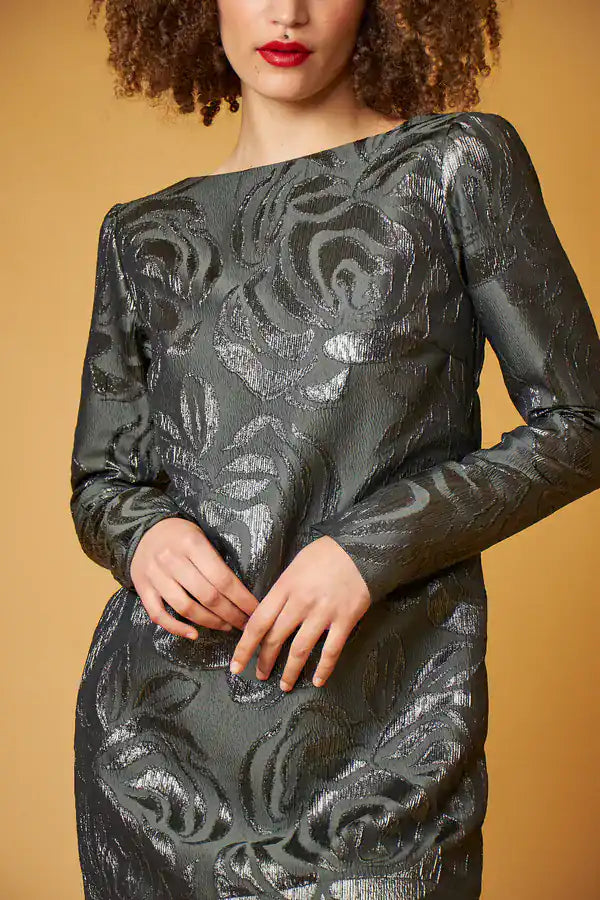 Shimmering floral jacquard dress, straight fit, rounded neckline, fitted long sleeves with invisible zipper, short length and deep V-neckline in the back.