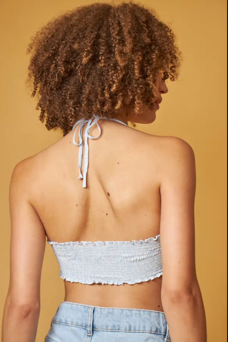 Bra top with a ribbon tie on the front, halter neck tie back and a thick elastic band for the back.