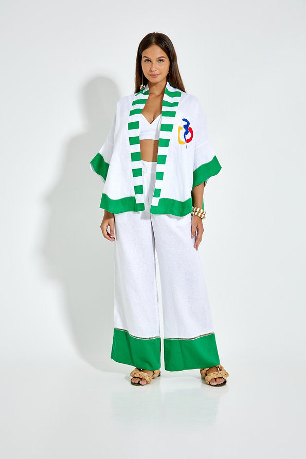 The Neila Pants showcase a wide-leg design, offering a modern and relaxed silhouette that moves effortlessly. Accentuated by a striking green hemline, these pants blend contemporary style with a subtle pop of color. Constructed from premium fabric, they provide both comfort and a polished appearance.