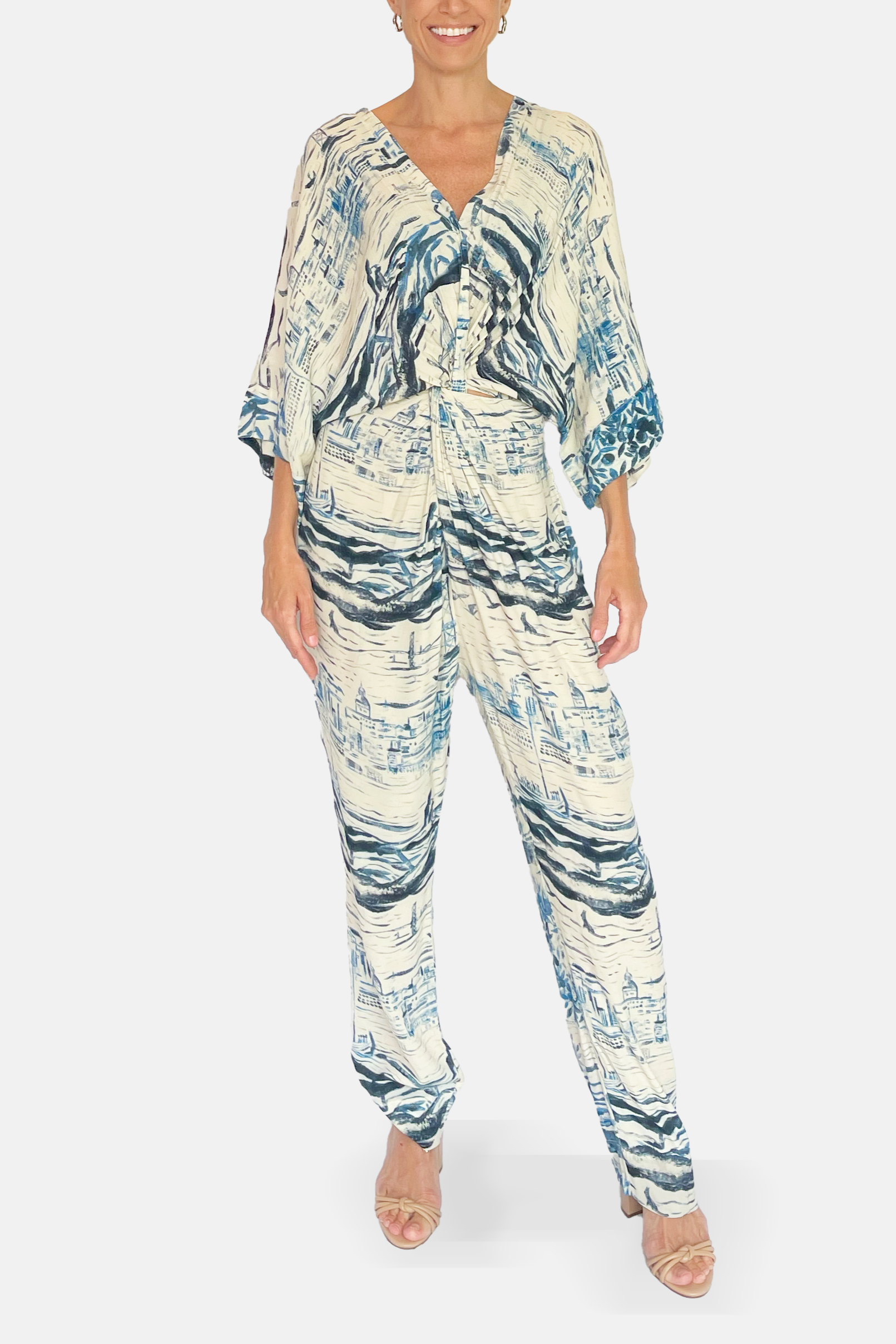 Jumpsuit with a city themed print, made with 100% viscose. Short sleeves with a plunging neckline, looped hole at back with a button fastening, elastic waistband.