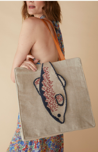 Bag made with natural fibres featuring a fish design closure with hidden magnet. Bag has a roomy interior and comes with leather straps. 100% Linen