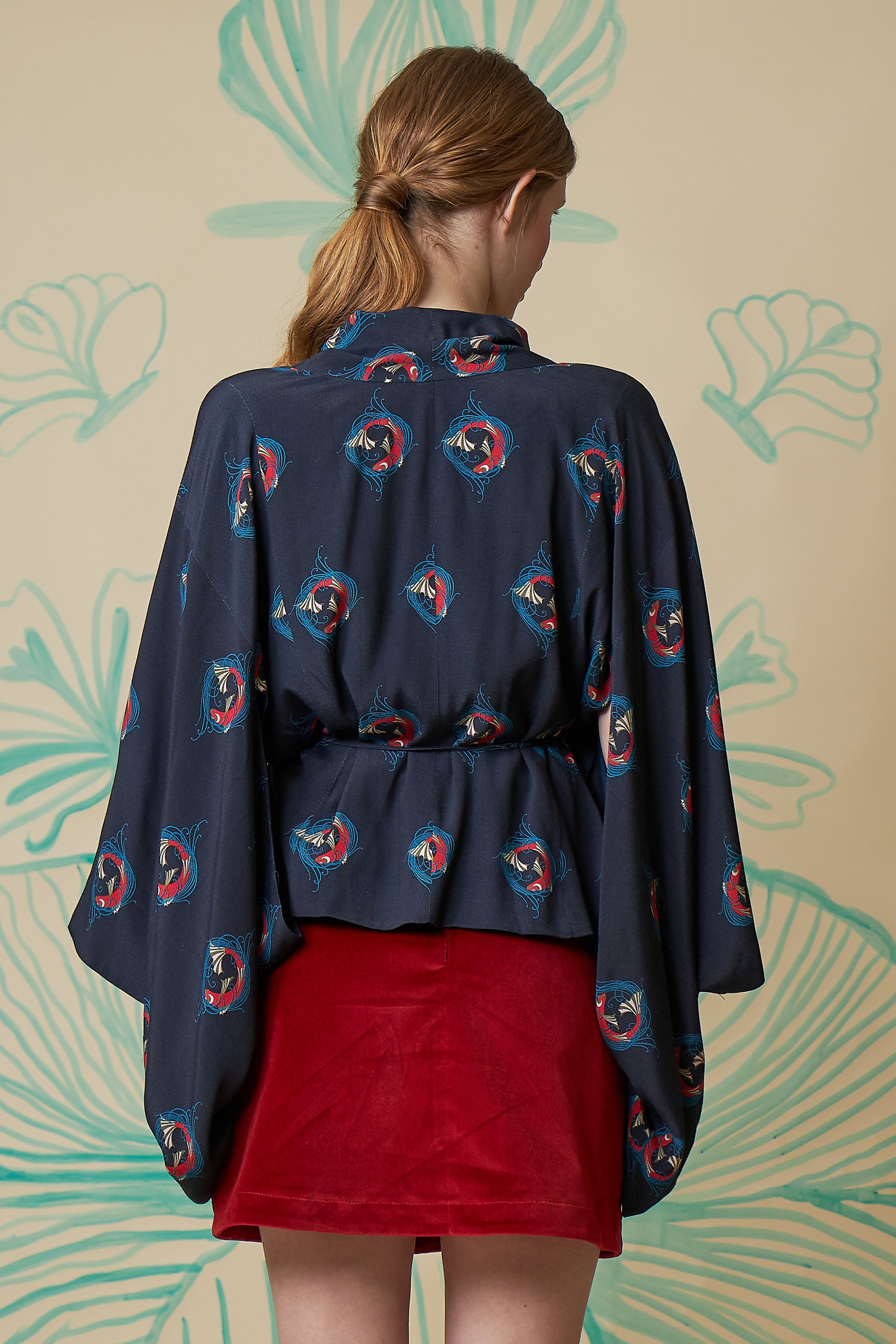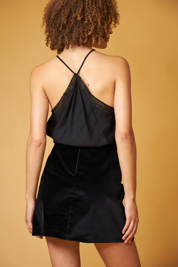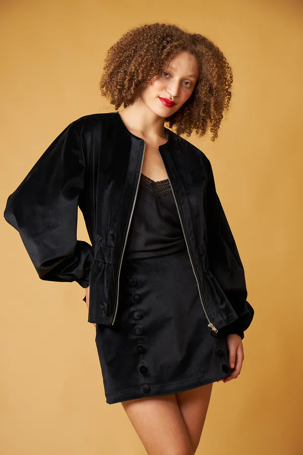 Skirt made of cotton velvet, straight cut, short length, velvet buttons on the front.