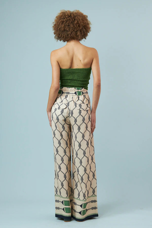 Trousers made from a viscose and silk blend, featuring an exclusive Le Soleil rope and buoy print, wide-leg style, elasticated waistband with a drawstring, front slash pockets and back straight pockets with flaps. The garment has a custom buoy-shaped toe cap.