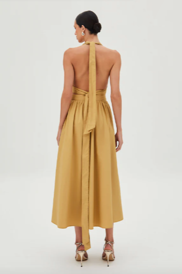 Cropped top in khaki Tricoline, designed with a draped bust for a soft, flattering effect. The halter neckline ties at the back with adjustable straps, adding both versatility and a touch of elegance to the short, modern silhouette.